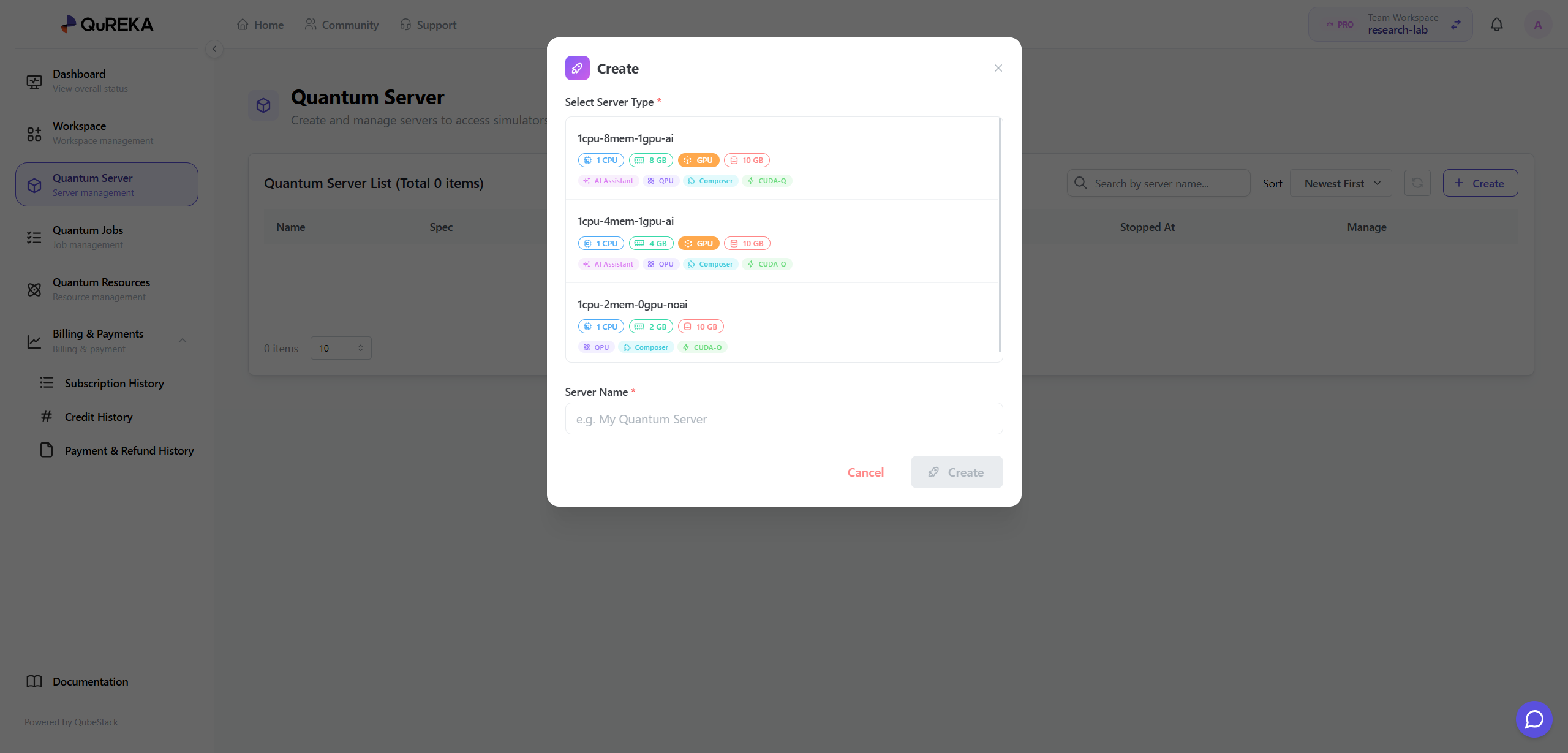 - How to Create: Click the [Create] button within the menu to create a new Quantum Server.