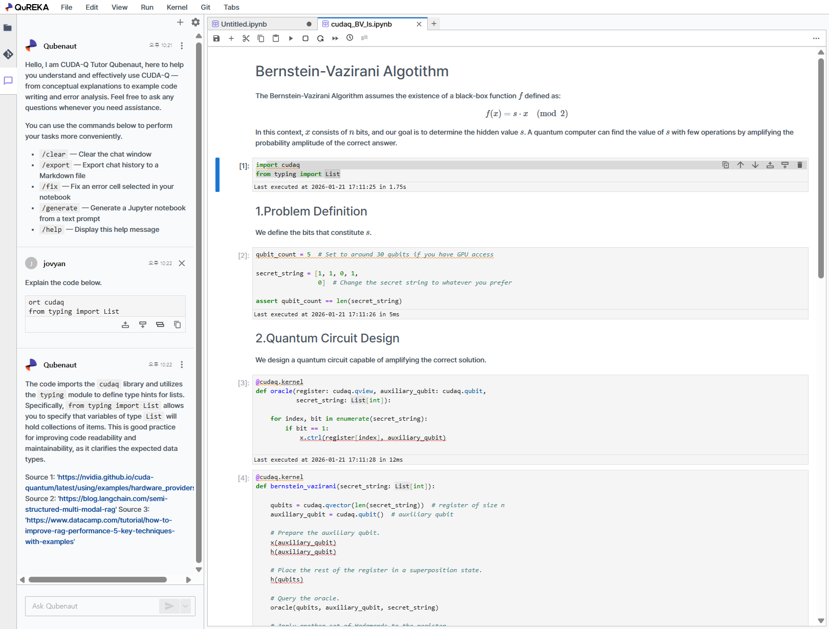 QuREKA Lab provides a powerful Python development environment based on JupyterLab, supporting an efficient workflow through dedicated extensions and AI-powered tools optimized for quantum algorithm development.